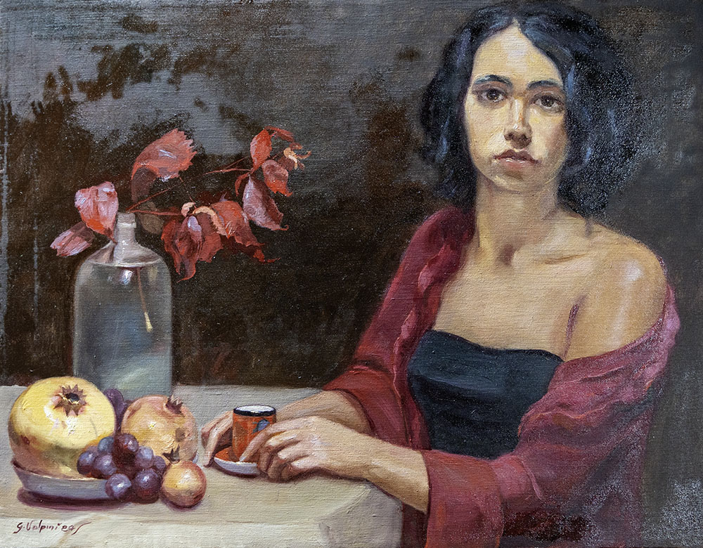 La posa volutamente evoca un momento della vita quotidiana, Mariapaola ha un’ espressione assorta, sta guardando l’ osservatore, ma sembra altrove.